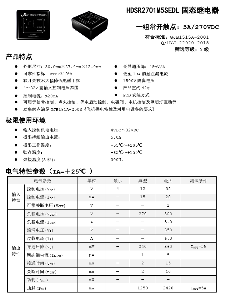 HDSR2701M5SEDL固態(tài)繼電器,一組常開觸點:5A/270VDC,PCB安裝方式,全國產(chǎn)。