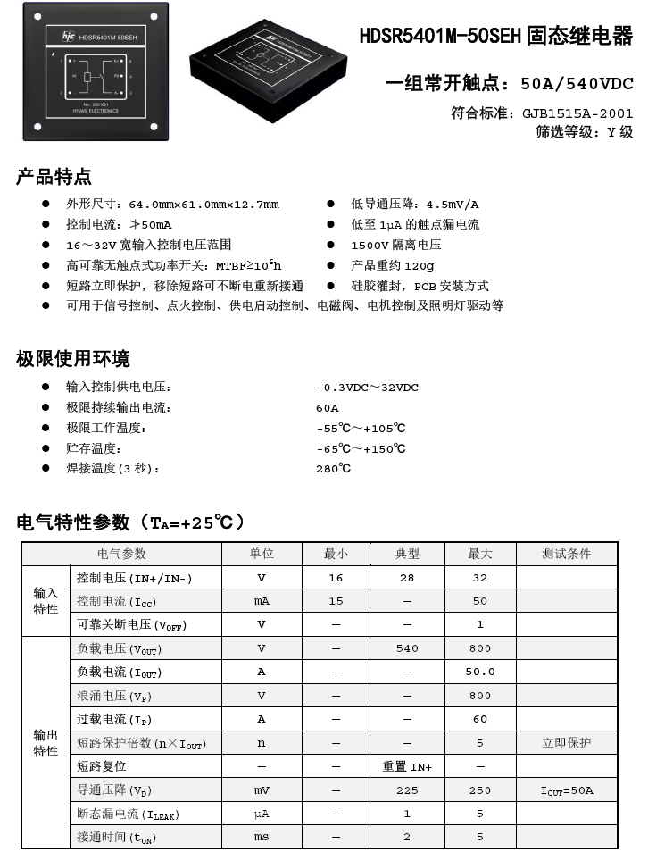 DC540V/50A直流單路固態(tài)繼電器,控制電壓DC16-32V,光電隔離,具備過載/短路保護(hù)功能,PCB安裝,全國產(chǎn)。