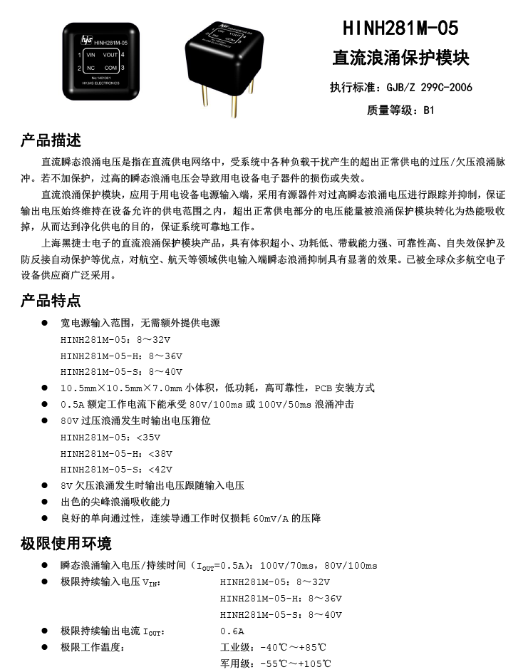 額定DC28V/0.5A,全國產(chǎn)過壓浪涌保護模塊。滿足GJB298、GJB181、DO160E等標準,PCB安裝。