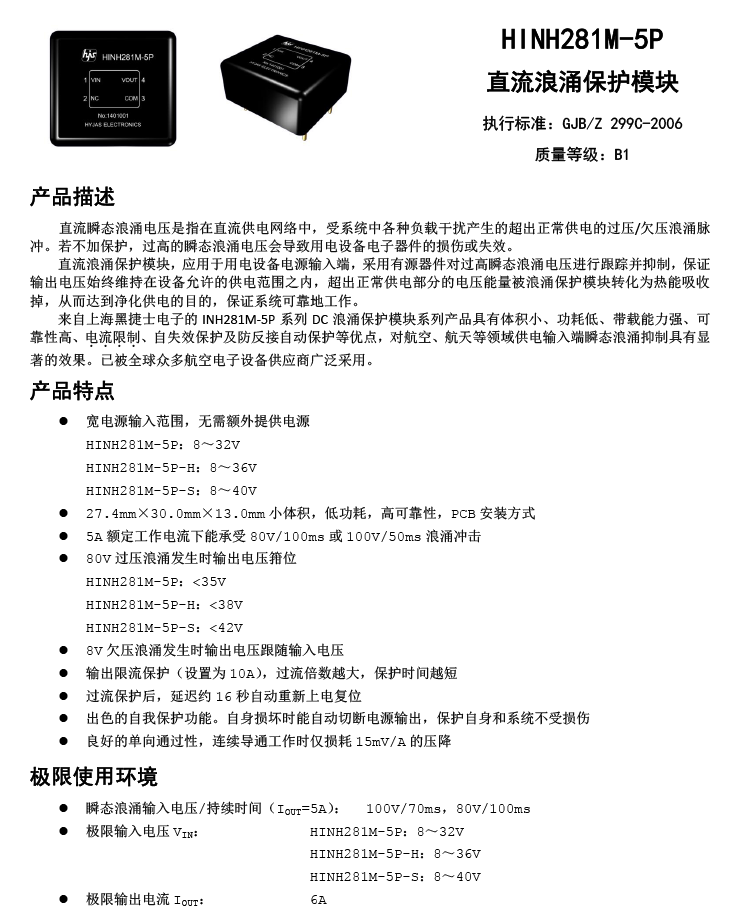 額定DC28V/5A,全國(guó)產(chǎn)過壓浪涌保護(hù)模塊,帶限流保護(hù)功能。滿足GJB298、GJB181、DO160E等標(biāo)準(zhǔn),PCB安裝。