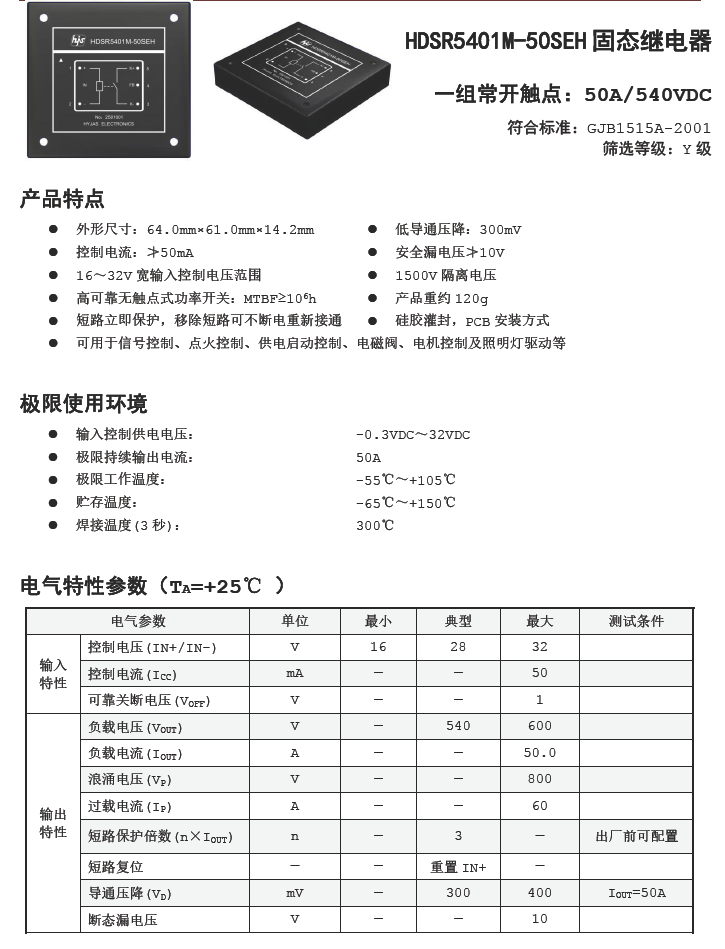 DC540V/50A直流單路固態(tài)繼電器,控制電壓DC16-32V,光電隔離,具備過載/短路保護功能,PCB安裝,全國產(chǎn)。